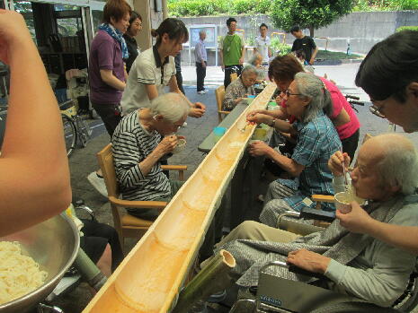 ご利用者と職員、地域の皆様が交流できる1年に1回の大イベントです。例年、飯田地区社協のボランティアの皆様、家族会の皆様、山原S型デイさくら会の皆様、職員の家族にご協力いただき、とても盛大に開催されます。特に地元山原の方々には、さくら会をはじめ、山原かっぽれ会、子供会の皆様にも参加していただき、お祭りを盛り上げていただいています。普段、足を運ぶことがない老人ホームかもしれませんが、こういった機会に地元の方々に老人ホームってどんなところか、知っていただくことができ、また、ご利用者の皆様も地域の方々と交流でき、とてもいい時間が流れます。